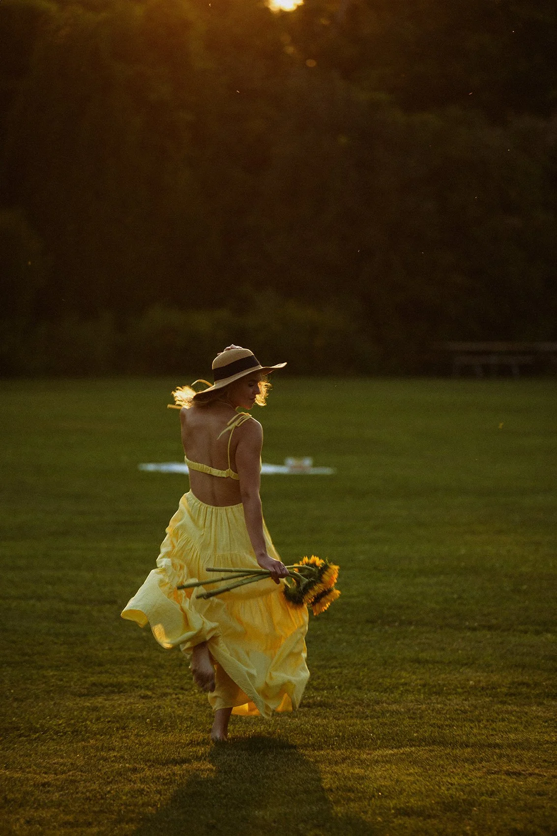 For this session, we wanted to create a dreamy, romantic vibe that highlighted the beauty of nature and the softness of the evening light. Eva brought three outfits that perfectly complemented the setting: a flowing blue floral dress, a crisp white dress perfect for a picnic vibe, and a vibrant yellow sundress paired with sunflowers. Each look captured the carefree, elegant essence of summer.