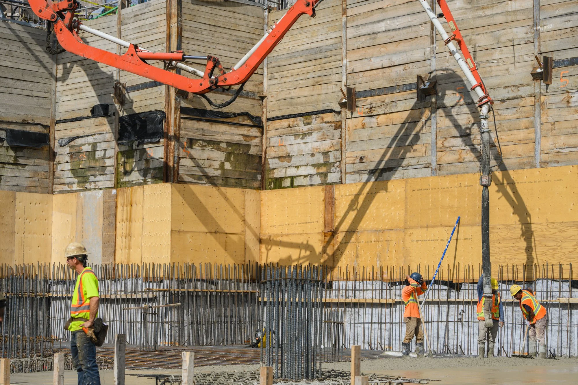 The rhythm of the pour - pumps snaking over the pit, the hose working, concrete texture mid-air.